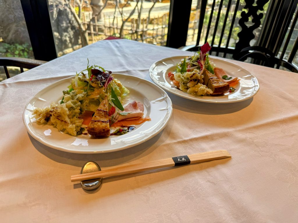 大蔵の特製ハムやキッシュ、春菊と、舞茸の天ぷらサラダにサーモン🌿